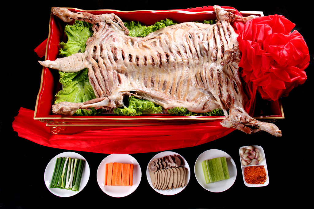 1. 15—16斤羊肉去掉头尾,前胸骨劈断,脊梁骨从里面劈断,保证外侧形好。羊腿肉厚的地方,用刀划开打花刀,身上打两指宽的刀。