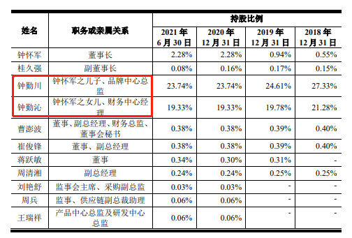 另外,钟怀军的两个弟弟钟怀勇、钟怀伟也是紫燕食品的股东,持股比例分别为0.90%、0.35%。也就是说,钟怀军一家人(含钟怀军兄弟)合计持有紫燕食品的股权高达87.23%。