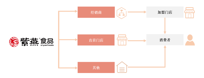 2016年之后,紫燕食品以买断式方式将产品销售至经销商,经销商再销售至加盟店,加盟店卖给消费者,即“公司——经销商——终端加盟门店——消费者”的两级销售网络。