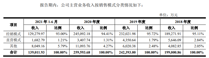 营收方面,2018年至2021年上半年(报告期内),紫燕食品的主营业务收入分别为19.9亿元、24.24亿元、25.96亿元、13.9亿元,其中经销模式的收入分别为18.93亿元、23.20亿元、24.51亿元、12.93亿元,占比分别为95.11%、95.72%、94.41%、93%。