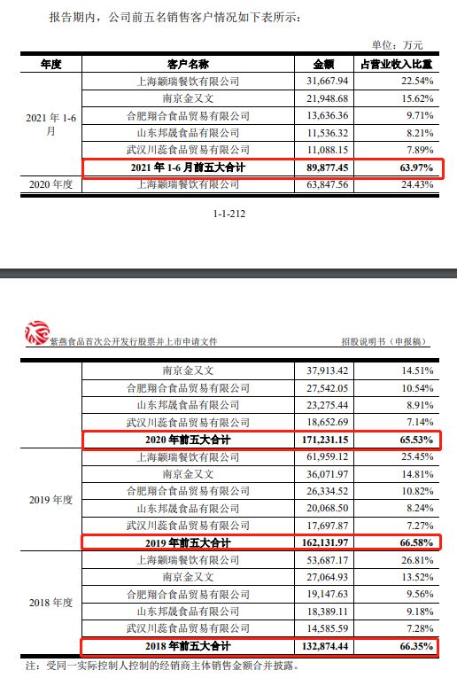 报告期内,紫燕食品的客户集中度较高,对前五名客户(经销商)的销售额分别为13.29亿元、16.21亿元、17.12亿元、8.99亿元,占营业收入比重分别为66.35%、66.58%、65.53%、63.97%,占经销收入的比例分别为70.21%、69.87%、69.85%、69.53%。对前五经销商依赖程度较高。