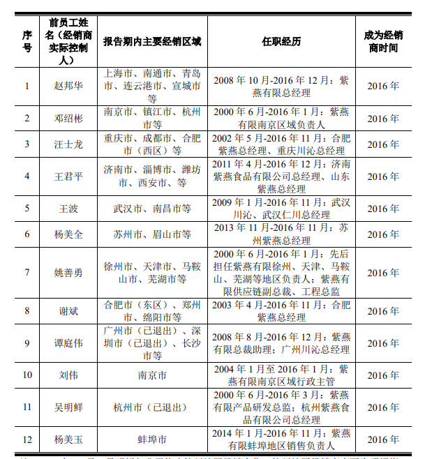 需要指出的是,紫燕食品前五大客户原本是紫燕食品各个销售区域负责人(总经理),在紫燕食品销售模式发生变动后,顺势成为各自负责区域的总经销商至今。