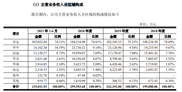 报告期内,华东区域是紫燕食品销售收入的主要地区,销售金额分别为14.82亿元、18.23亿元、19.42亿元、10.32亿元,比例分别为74.49%、75.23%、74.81%、74.11%。