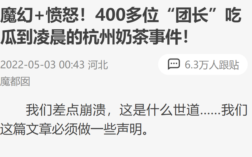 5月3日凌晨,一篇名为《魔幻+愤怒!400多位“团长”吃瓜到凌晨的杭州奶茶事件!》的帖子疯传,6.3万人跟帖。