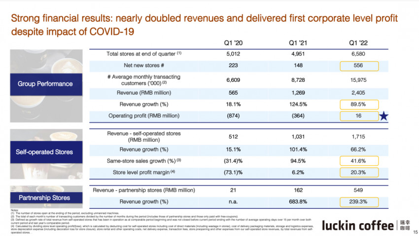 除了净收入和营业利润大幅提升外,财报显示,第一季度,瑞幸净新开店数为556家,与截至2021年第四季度末的门店数量相比,门店数量环比增长9.2%。截至2022年3月31日,瑞幸门店总数达到6580家,包括4675家自营门店和1905家联营门店。