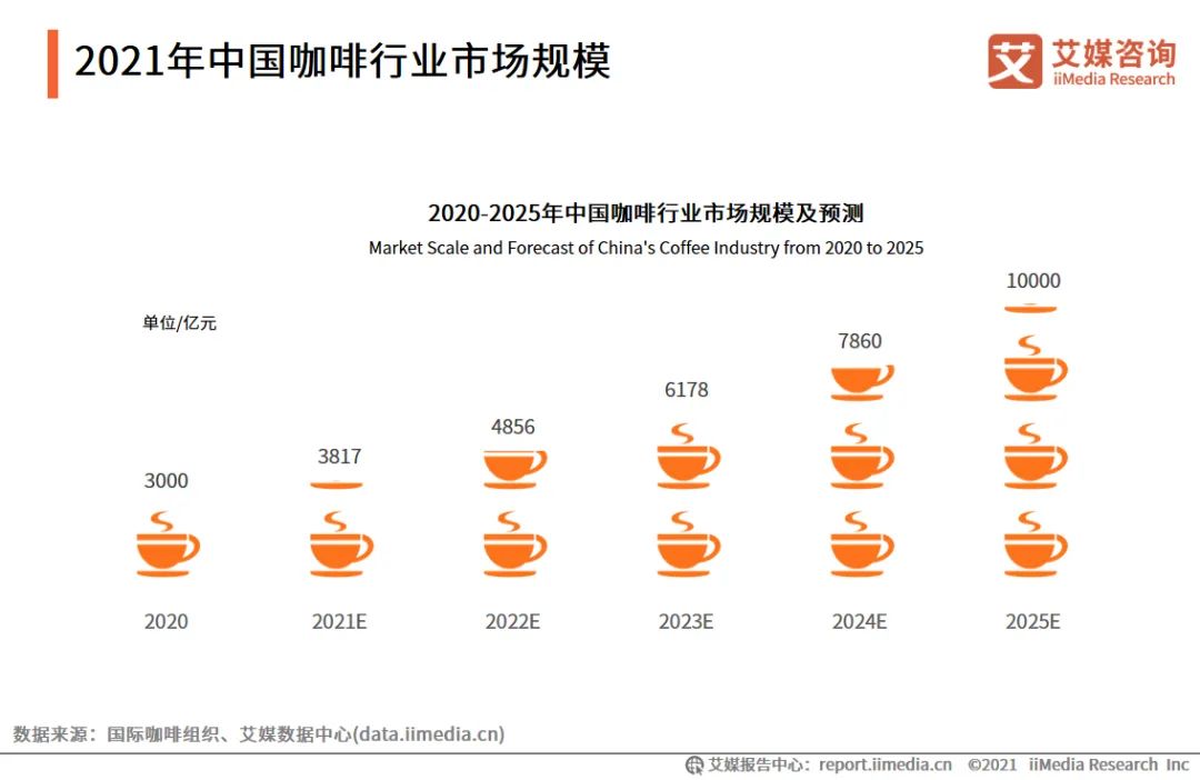 近几年,国内咖啡市场一直处于高速增长的时期。据艾媒咨询预测,2021年,中国咖啡市场规模约3817亿元,预计咖啡行业保持27.2%的增长率,到2025年,中国咖啡市场规模将达10000亿元。