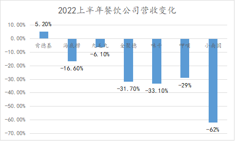 以国内市值最高的三家餐饮上市公司为例,海底捞、九毛九、呷哺呷哺上半年营收分别下滑16.6%、6.1%、29%。其他市值更小的公司,下降更为严重,小南国甚至下降了62%。