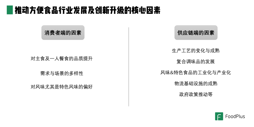 在文章开头我们也提到方便食品是常看常新的行业与市场,推动行业发展以及创新与升级的核心因素是:消费者端的因素和供应链端的因素。
