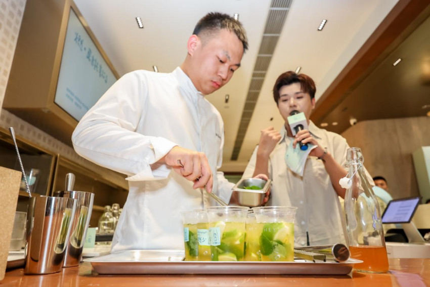 在广州天环广场LAB店的“灵感茶话会”活动中,除了喜拉朵新品,喜茶还带来了活动限定特调饮品莫吉托特调,通过融入绿妍茶汤,在清新爽冽的经典莫吉托风味之中,呈现出沁人茶香。燃少更现场展示调制手艺,为来到喜茶的观众还原《一饭封神》中“莫吉托仙人”的出圈场景。在邀请大家品尝新品的同时,燃少还特别介绍了燃·莫吉托喜拉朵及特调中的产品灵感,“和节目中不同的是另外增加了茶香,是对莫吉托的另一种表达,希望给大家带来自然、干净的感受。”