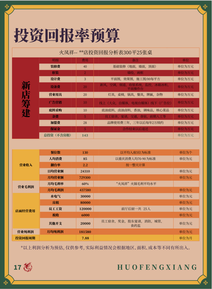 与加盟商的感受不一样,在宣传资料中,明星品牌火锅店大多描述了美好的加盟“钱”景。