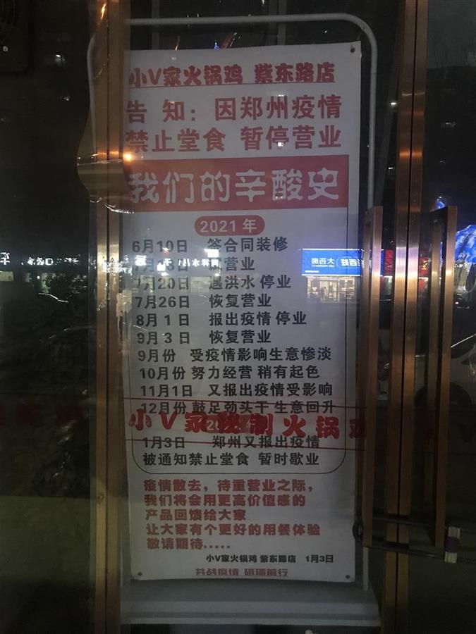 “2021年7月18日试营业,7月20日遇洪水停业,7月26日恢复营业,8月1日因疫情停业,10-12月经努力经营生意回升,2022年1月再因疫情歇业……”近日,郑州一餐馆在店门口张贴“我们的辛酸史”暂停营业通知引发网络关注。很多网友对该店老板的遭遇表示同情,感叹餐饮业不易,还有不少网友留言给该老板加油鼓劲。