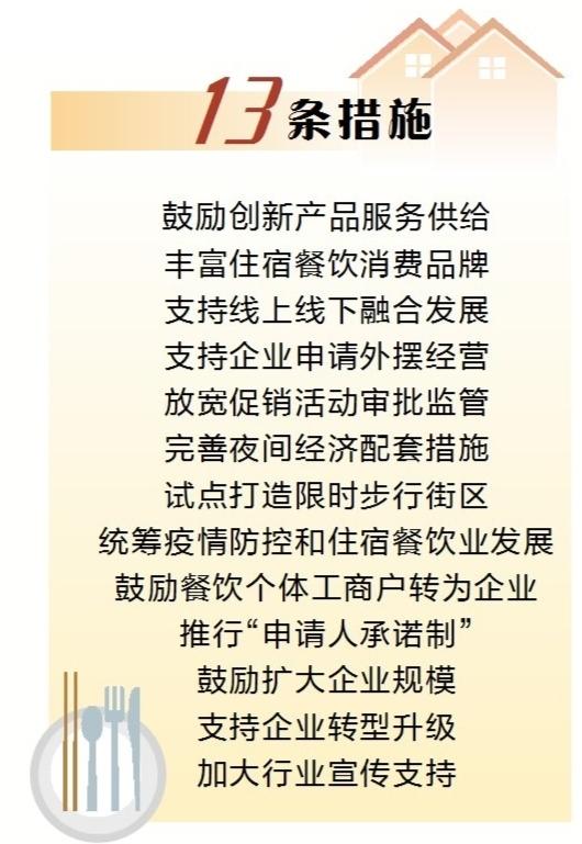 《若干措施》从激发市场活力、优化政务服务、加大扶持力度等方面,制定了鼓励创新产品服务供给、丰富住宿餐饮消费品牌、支持线上线下融合发展、支持企业申请外摆经营等13条措施,进一步优化住宿餐饮消费供给,释放消费潜力,增强消费动能,促进行业发展。